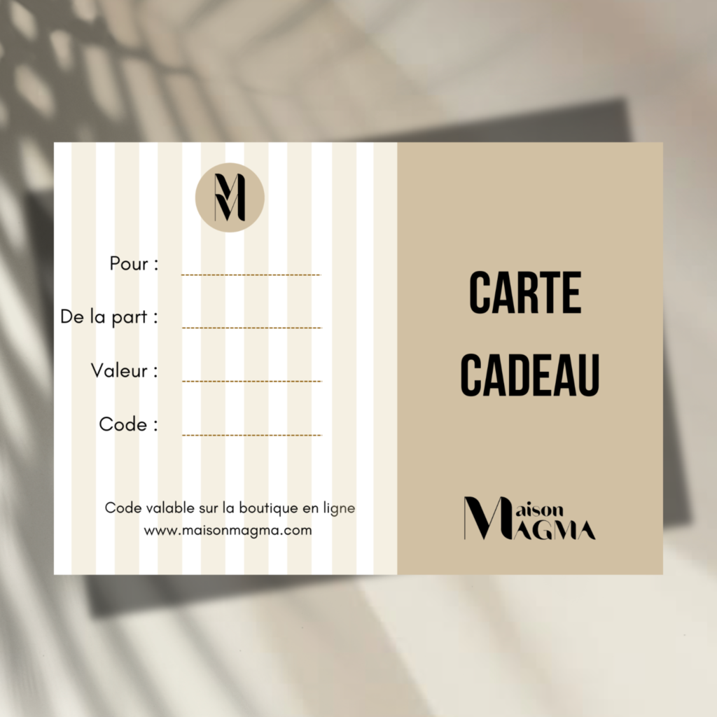Disponible au montant de votre choix, notre carte cadeau s’adapte à tous les budgets et à toutes les occasions : anniversaire, fête, ou simplement pour faire plaisir.